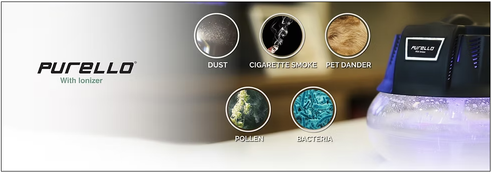 - Purello 释放负离子,有助于清除灰尘、香烟烟雾、宠物皮屑、花粉、霉菌孢子、病毒和细菌,对健康有益